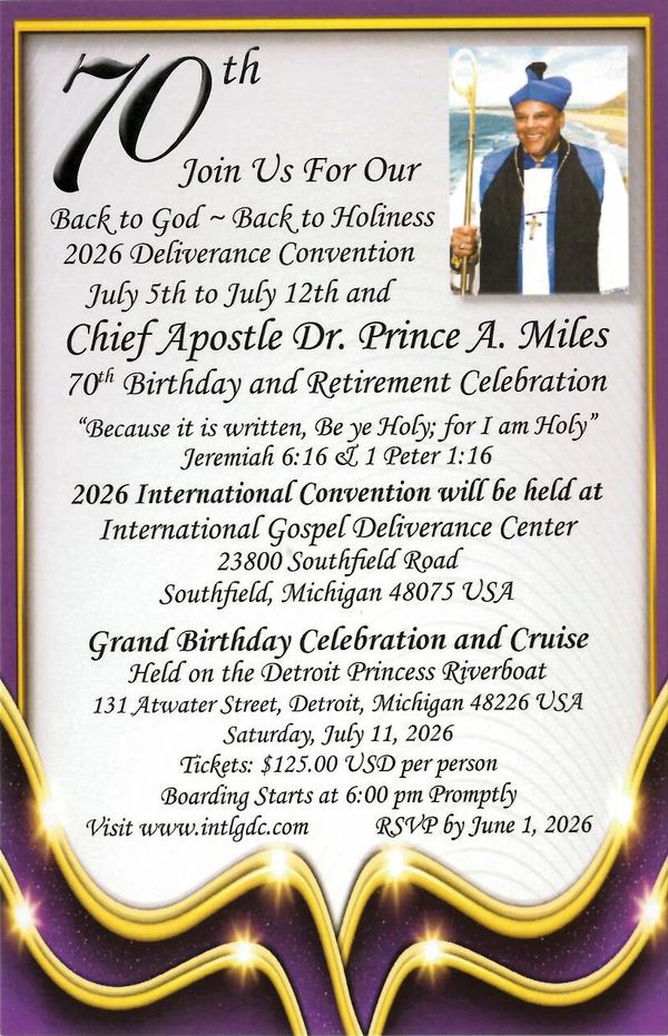 Come hear a right-now Word from the Lord! Come get your healing, deliverance, salvation, and touch from the Lord. Make sure you get your ticket to celebrate Chief Apostle‘s 70th birthday and retirement. Click the button below to go to the Convention Page for more information.